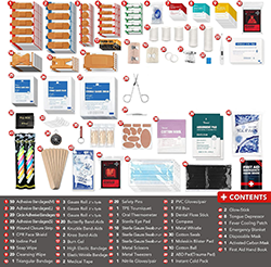 Omfattande komponenter: Sårvård: Bandage, gasbindor, tejp, antiseptiska våtservetter