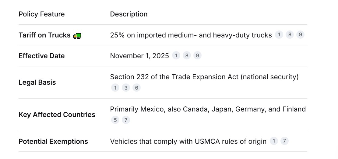 1. Policymotiv: Denna tariff är baserad på en undersökning enligt avsnitt 232 som lanserades i april 2025, som drog slutsatsen att beroendet av importerade lastbilar hotar USA:s nationella säkerhet och den inhemska logistikkedjan. Målet är att skydda amerikanska tillverkare och jobb.